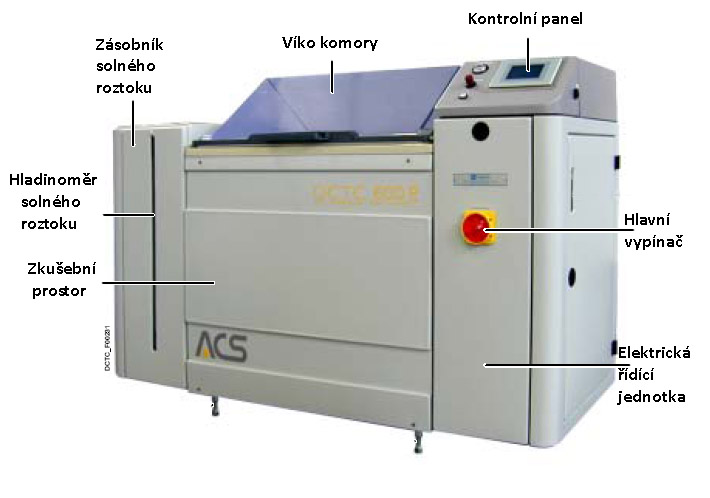 Zkušební zařízení musí mít objem nejméně 0,4 m3, aby bylo možné zajistit podmínky homogenity a rovnoměrné distribuce solné mlhy. Horní části komory musí být konstruovány tak, aby kapky rozprašovaného roztoku, které kondenzují na jejich povrchu, nestékaly na zkoušené vzorky. Hlavní části korozní komory firmy Angelantoni industrie jsou znázorněny na obr. 14.