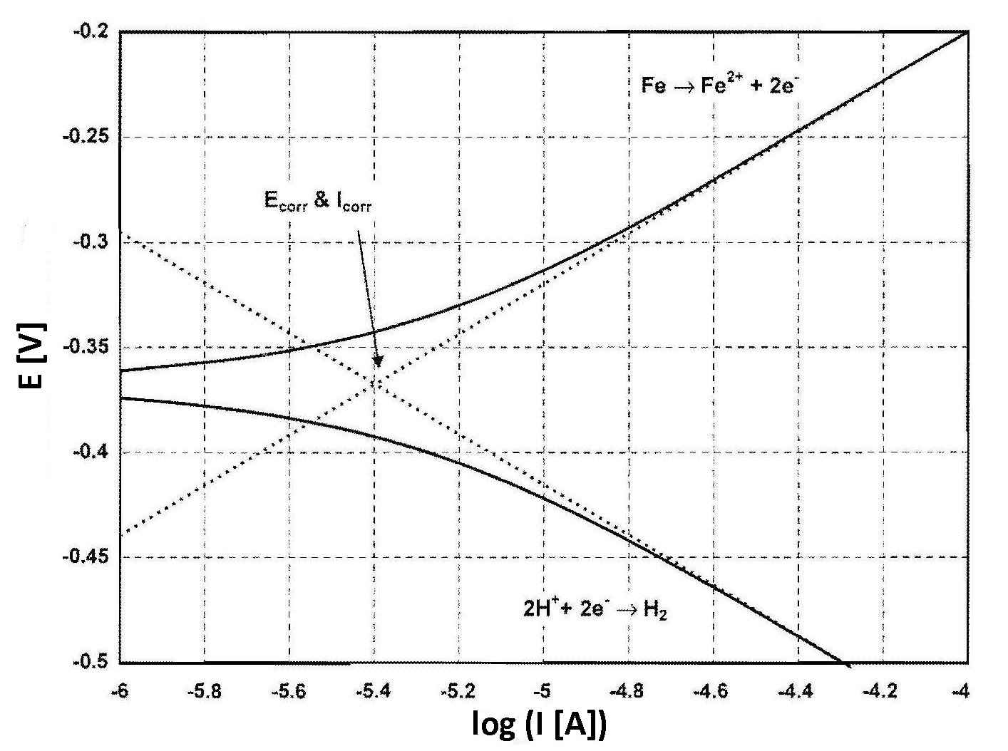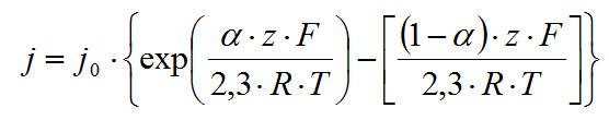 Vztah mezi korozní proudovou hustotou jkor a přepětím η je dán rovnicí Butler-Volmerovou (15) a po její úpravě ji lze vyjádřit ve tvaru (15):